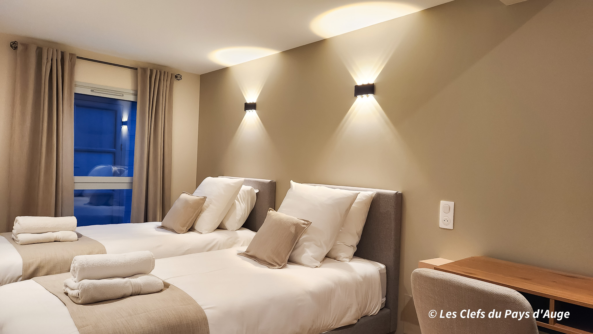 Les lits doubles sont en 160 × 200 cm et les lits simples en 90 × 200 cm, garantissant un confort optimal.